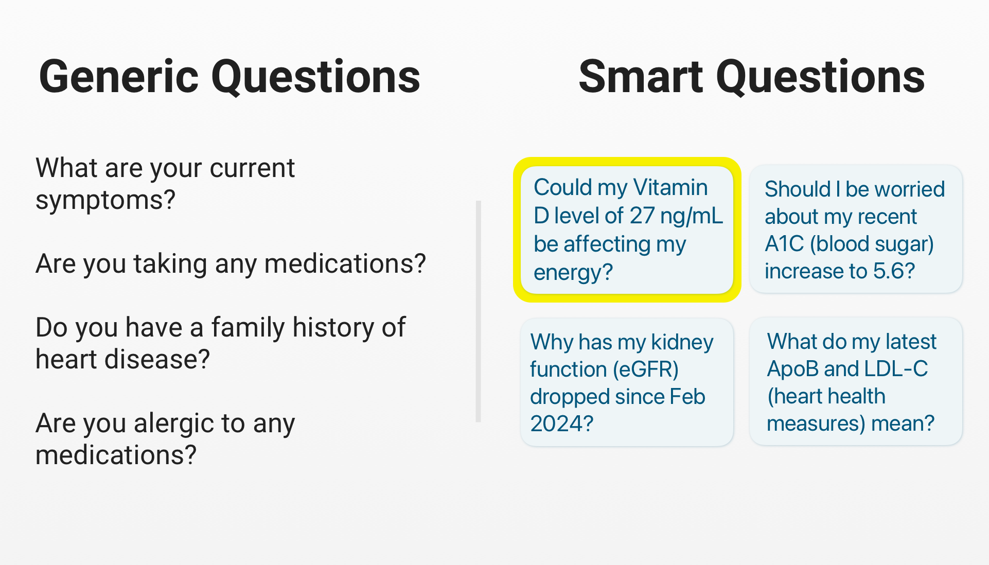 One HealthScout user’s vitamin D came back at a “normal” 27 ng/mL. But HealthScout noticed it was at the low end of the range and generated a Smart Question Card: “Could my Vitamin D level of 27 ng/mL be affecting my energy?” She’d been feeling tired for months and hadn’t connected it to anything. She brought the question to her doctor, who agreed with the assessment and started her on supplements. Her energy came back. She wouldn’t have known to ask about vitamin D without HealthScout.