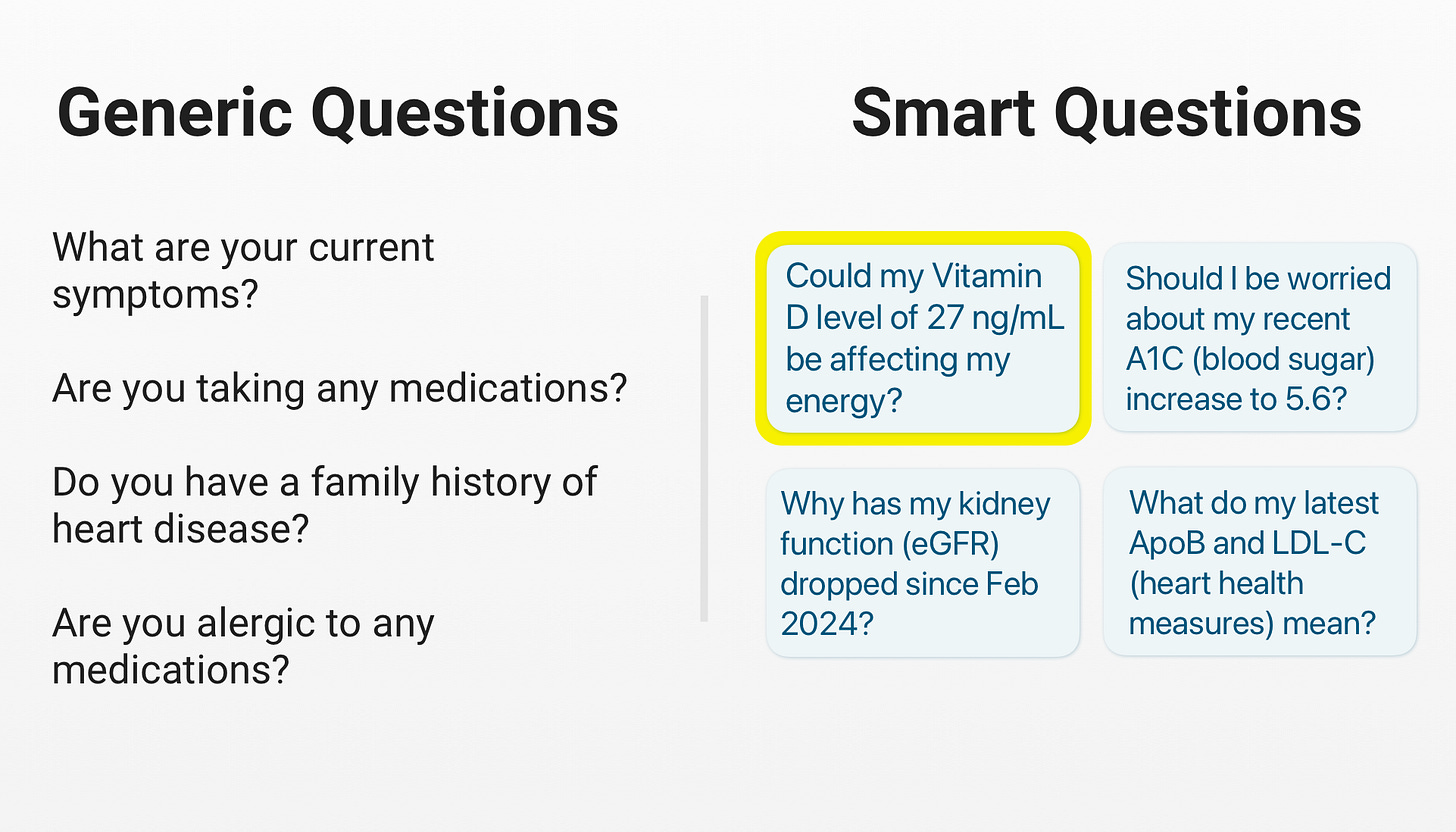 Doctors consistently report that patients who come in prepared have better appointments. A patient who asks “My A1C went from 5.1 to 5.6 in three years. Is it OK as long as I don’t get into the pre-diabetes range?” gets a different conversation than one who asks “is everything okay?”