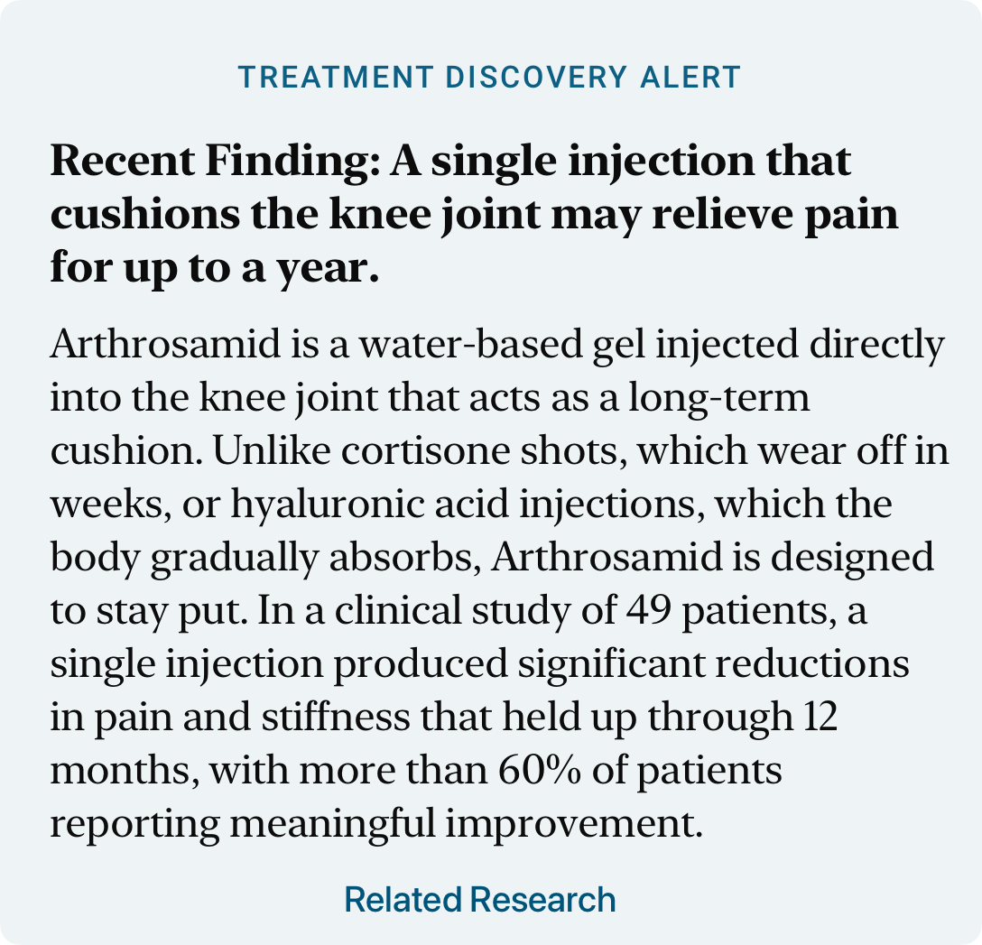 When I asked my orthopedic specialist about a new knee treatment called Arthrosamid, he hadn’t heard of it. A month earlier, neither had I.