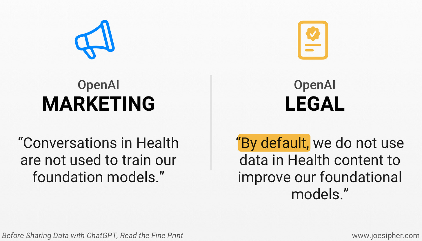 Saying “Conversations in Health are not used to train our foundation models” is a commitment. “By default, we do not use content in Health” is a policy, one that can be changed. Policies get updated all the time, often announced with an email that no one will read.